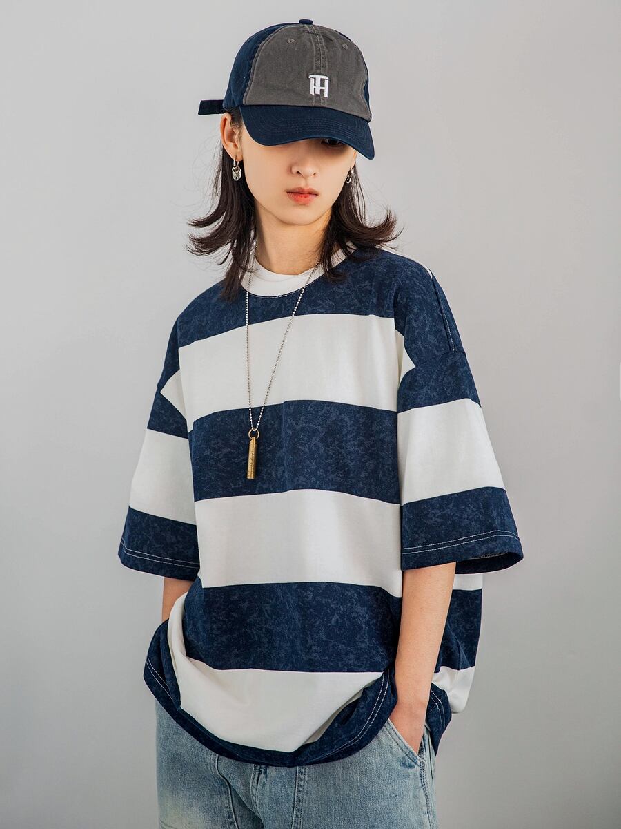 ストライプラウンドネック半袖Tシャツ
