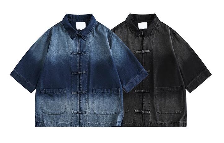 レトロラペルボタン半袖デニムシャツ